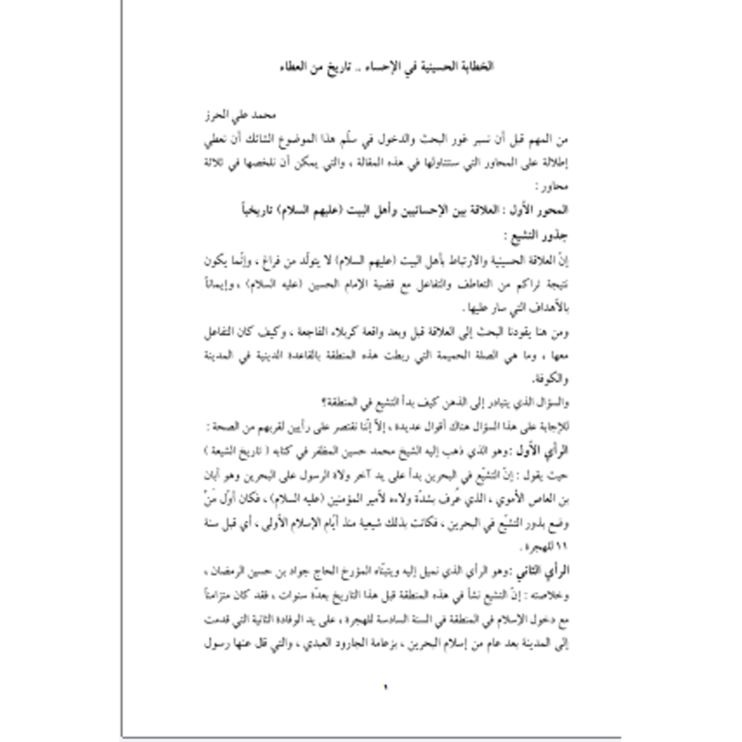 کتاب «الخطابة الحسينية في الأحساء» اثر محمد علی الحرز به بررسی تاریخ و سیر تحولات خطابههای حسینی در منطقه احساء پرداخته است. نویسنده با تجزیه و تحلیل رویدادهای تاریخی و فرهنگی، تأثیر این خطابهها بر جامعه و نقش آنها در زنده نگهداشتن یاد و فلسفه عاشورا را مورد بررسی قرار میدهد. همچنین، الحرز به سبکها و روشهای مختلف خطابه در احساء و تأثیر آن بر وحدت اسلامی و هویت فرهنگی مردم این منطقه میپردازد. این کتاب بهعنوان منبعی ارزشمند برای مطالعه تاریخ عزاداری و فعالیتهای مذهبی در احساء شناخته میشود.