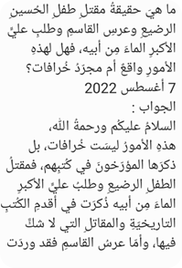 کتاب “ماحقيقة وقائع مقتل الطفل الرضيع وعرس القاسم وطلب علي الاكبر الماء” به بررسی وقایع عاشورا و تاثیرات آن بر تاریخ و فرهنگ اسلامی میپردازد. نویسنده در این کتاب به تجزیه و تحلیل وقایع دردناک کربلا، از جمله کشته شدن کودک رضیع امام حسین (ع) و درخواست آب علی اکبر (ع) میپردازد. با تمرکز بر عواطف انسانی، وفاداری و ایثار، نویسنده سعی دارد تا ابعاد معنوی و اجتماعی این حوادث را به تصویر بکشد و پیامهای عمیق آن را برای نسلهای آینده بازگو کند. همچنین، کتاب به بررسی عروسی قاسم و رابطه آن با حماسه عاشورا میپردازد و به چگونگی تأثیر این وقایع بر هویت اسلامی و شیعی اشاره دارد.